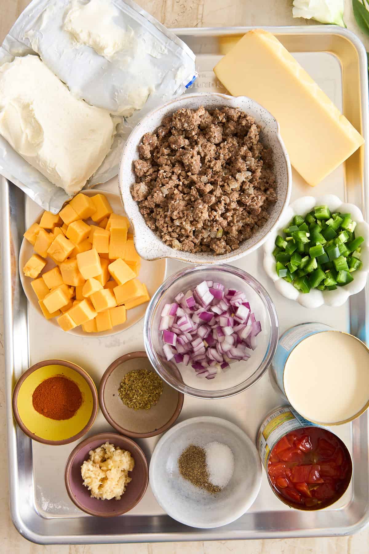 Admittedly, the ingredients in our queso fundido dip aren’t exactly authentic. However, they are easy to find and create an incredible flavor that even the pickiest of guests will love! Here’s what you’ll need: