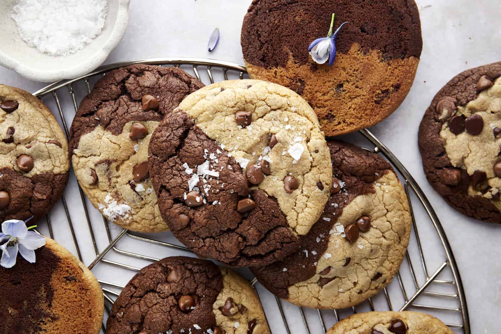 - Combine the Doughs. Scoop equal portions of each dough, then gently press them together to form one cookie ball. Roll it lightly in your hands to marble the doughs together and place on a parchment-lined baking sheet. Sprinkle a bit of flaky sea salt on top.