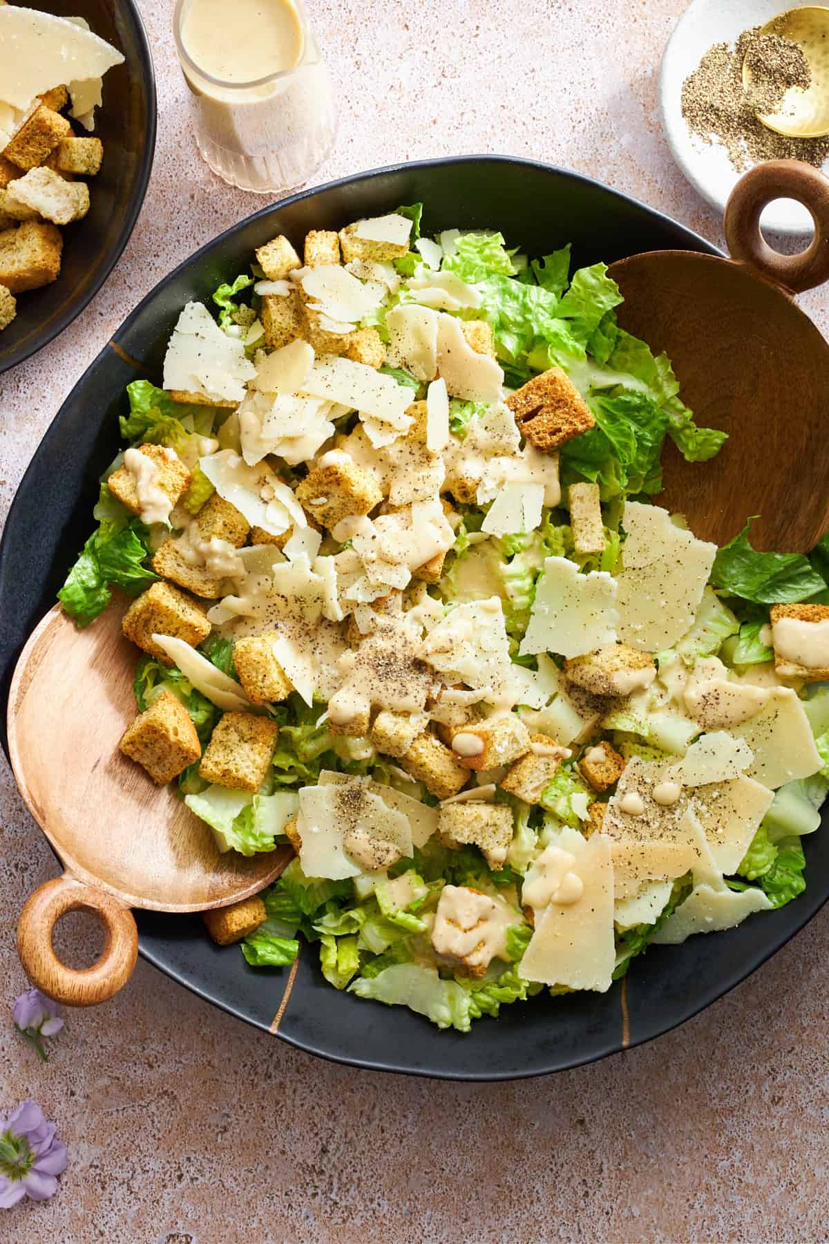 - Put the Salad Together. Add the chopped lettuce, shaved parmesan, and croutons to a large salad bowl. Top with the dressing and toss to evenly coat the lettuce.