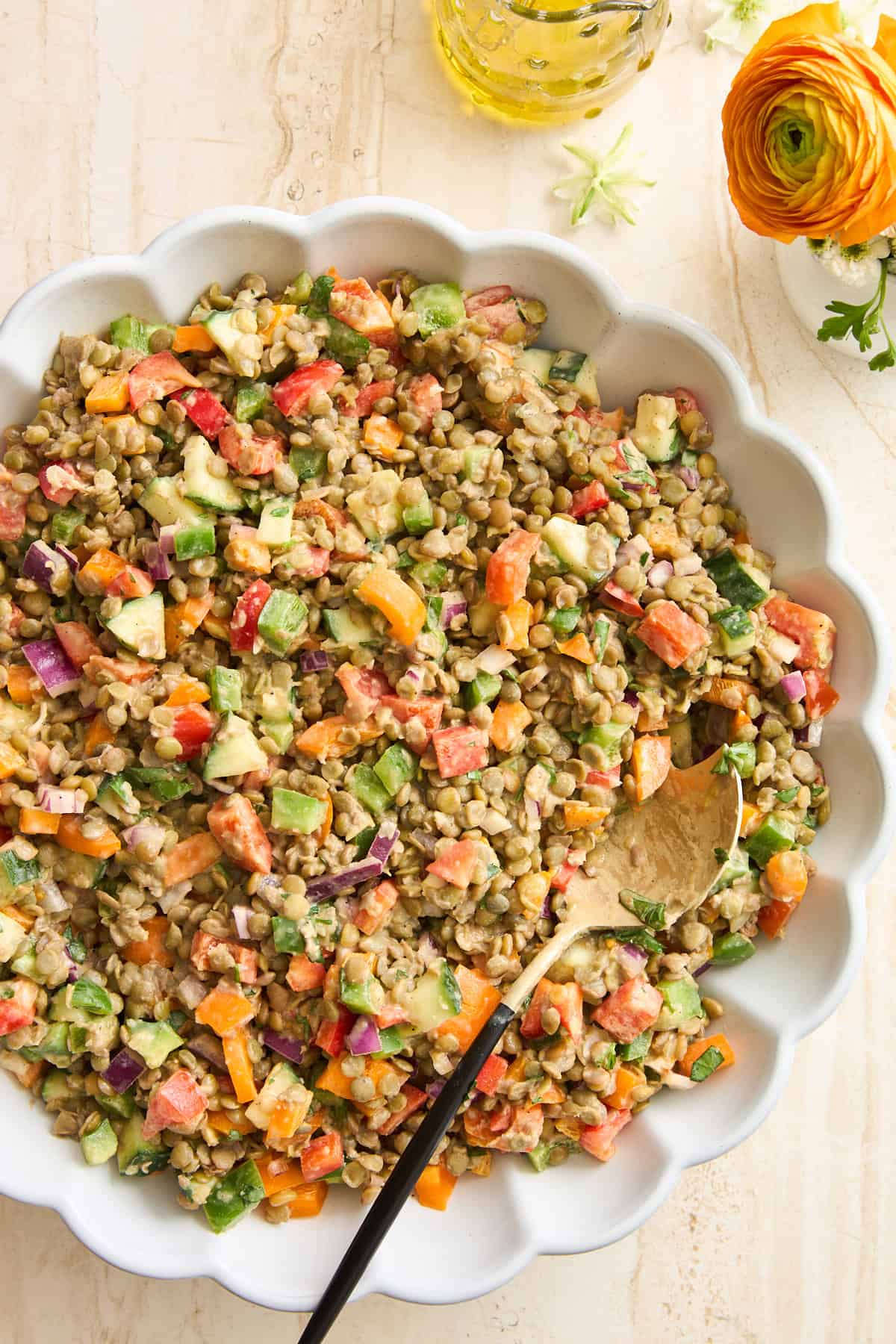 - In a large bowl, add the cooked lentils, chopped veggies, and parsley. Mix to combine.1 red bell pepper, chopped, 1 orange bell pepper, chopped, 1 green bell pepper, chopped, 1/2 red onion, chopped, 1 English cucumber, chopped, 2 medium tomatoes, chopped, 1/2 cup Italian parsley