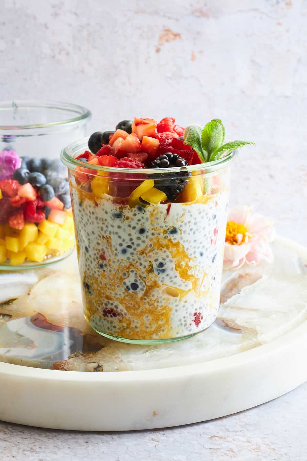This pudding isn’t complete without a colorful burst of fresh fruit on top! We add juicy mango chunks that bring a tropical vibe and pair them with a mix of berries that add bursts of flavor and color. Whether you’re enjoying it as a nutritious breakfast, a light dessert, or a snack, this pudding is the perfect blend of creaminess and fruitiness with a touch of sweetness, too!